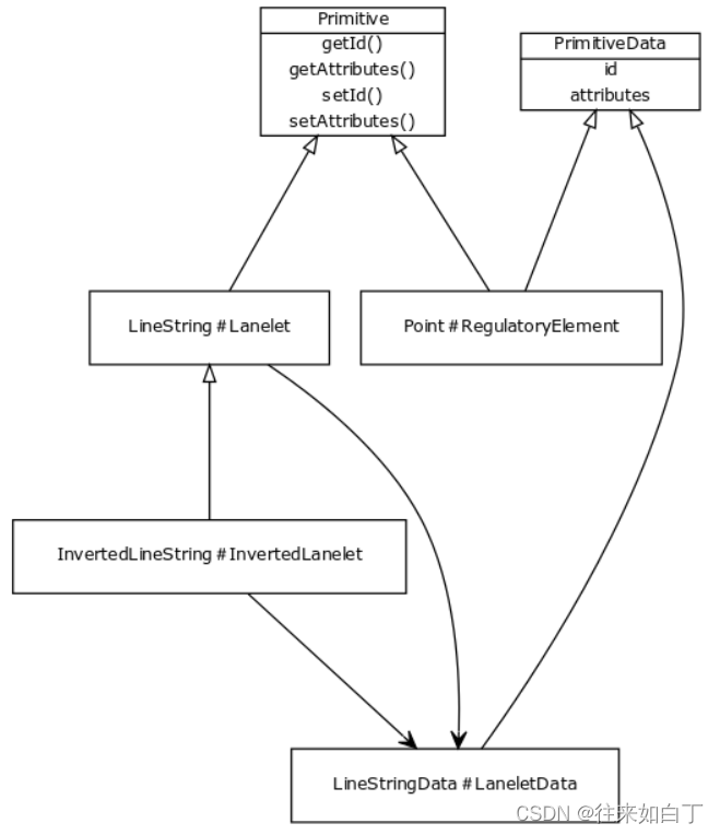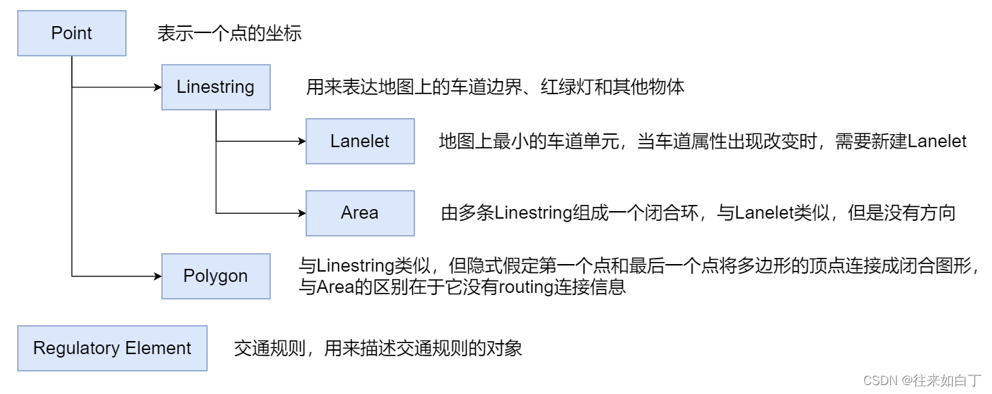 - 关联层(relational layer,与物理层相关联的车道lanelet,区域area以及交通规则。包含所有对pyhical layer元素的抽象表述,这样所有的地图信息都有道路实体元素承载)