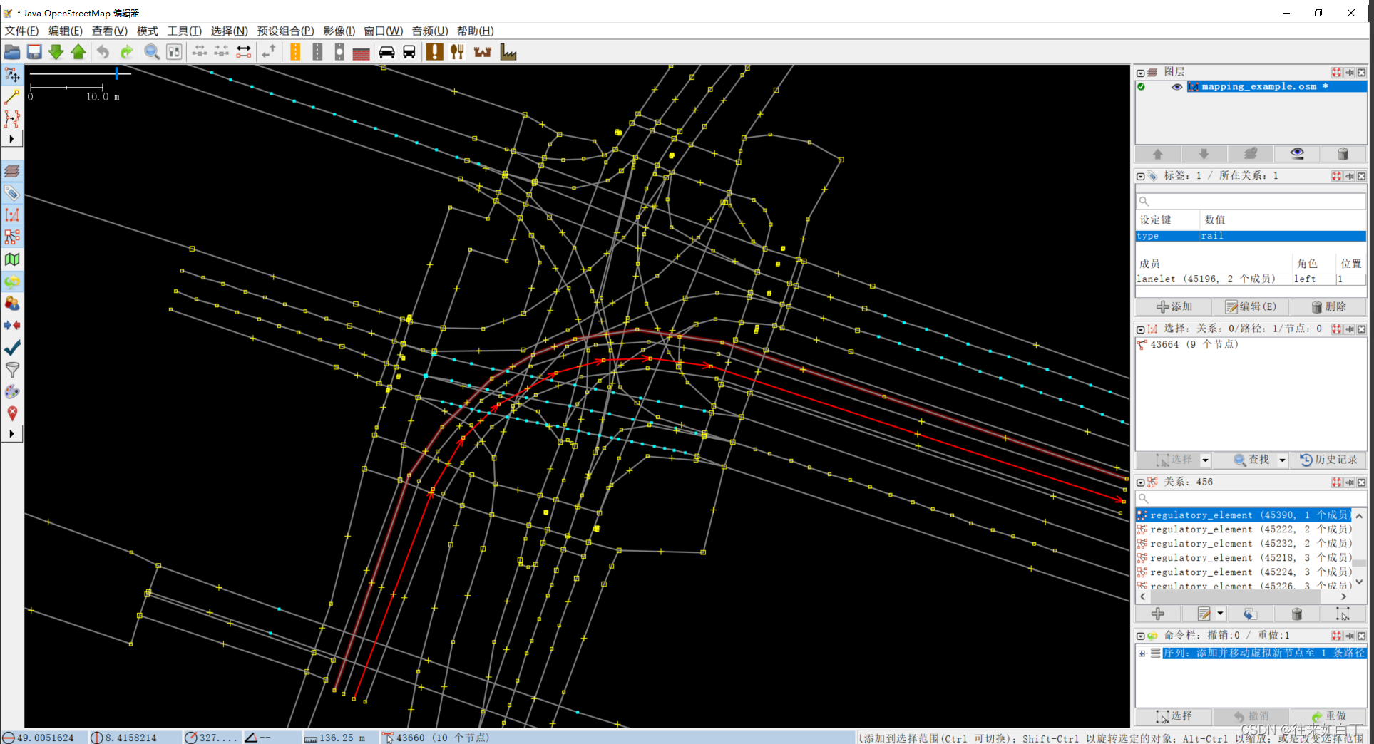 - lanelet2框架下的相关内容在上面给出的论文和源码说明中介绍的十分详细,网上也有许多相关辅助参考。源码中 lanelet2_examples/ 下给出的例程较为详细地说明了增删改查各种元素、地图、路径等等基本操作。