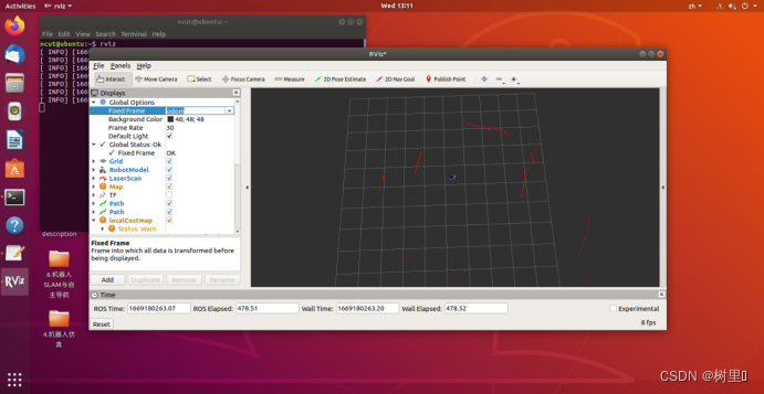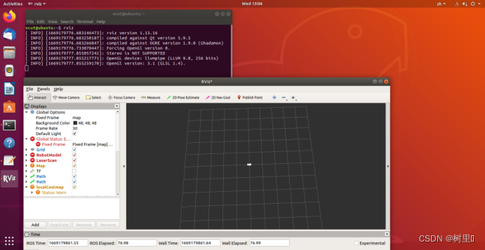 如果想在rviz里显示小车的运动路径的话,需要先完成上述操作,然后在Ubuntu开启一个终端运行指令rviz,打开rviz。