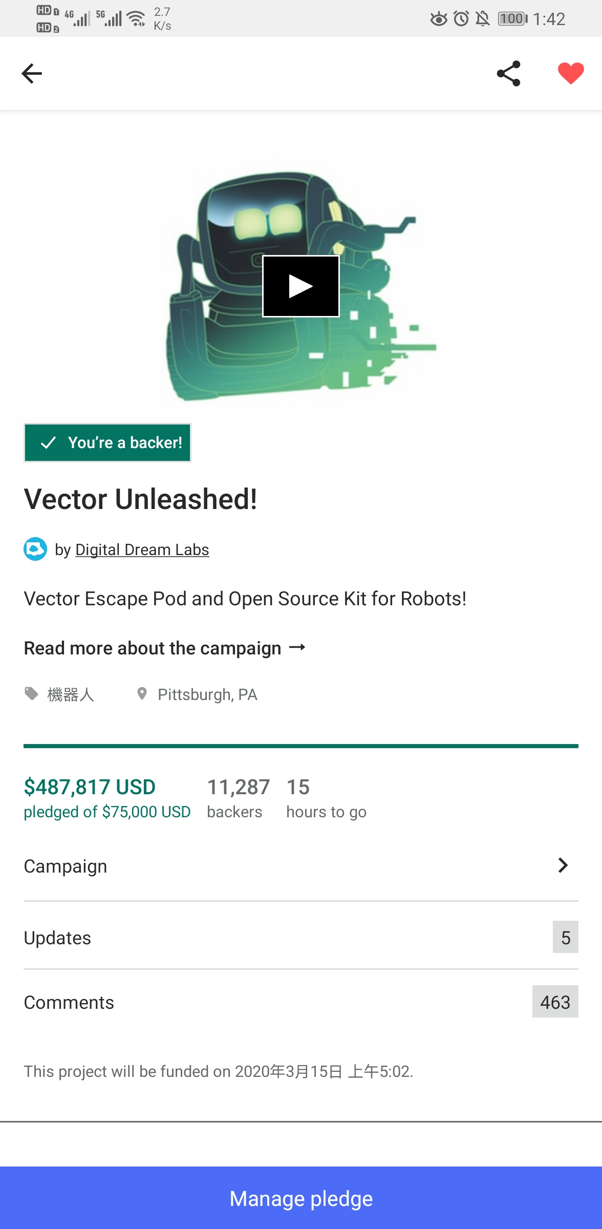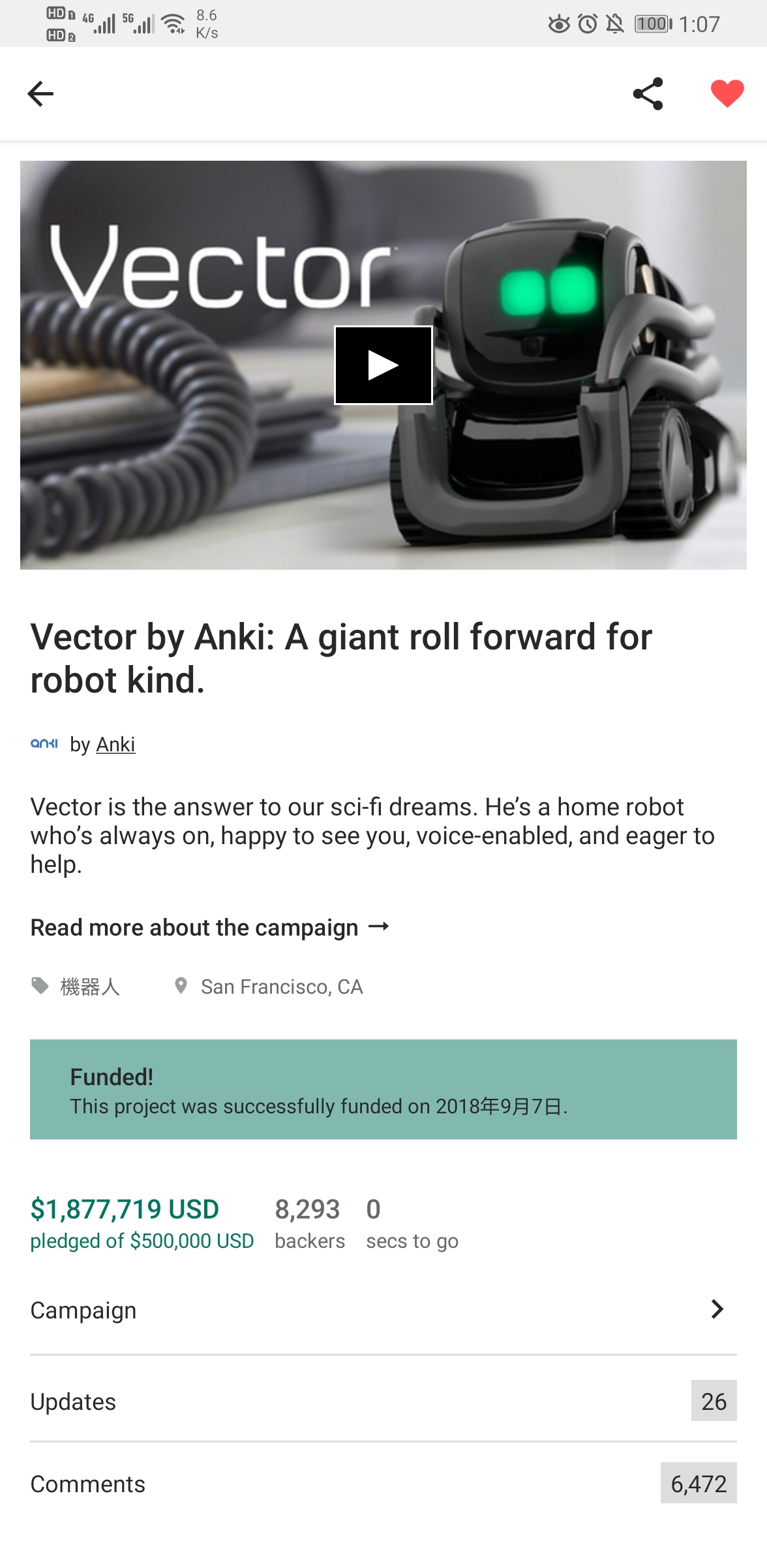 可能anki公司也想通了,最终他们决定要开发vector,并在kickstarter上发起了众筹。众筹是成功的,一共获得了187万美元的支持。