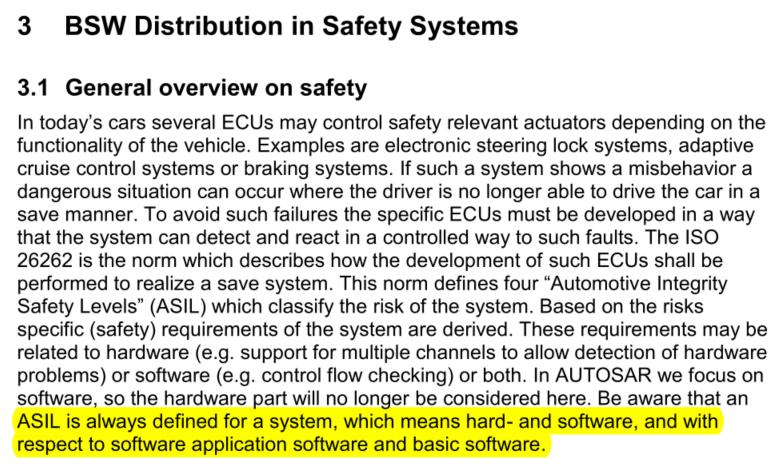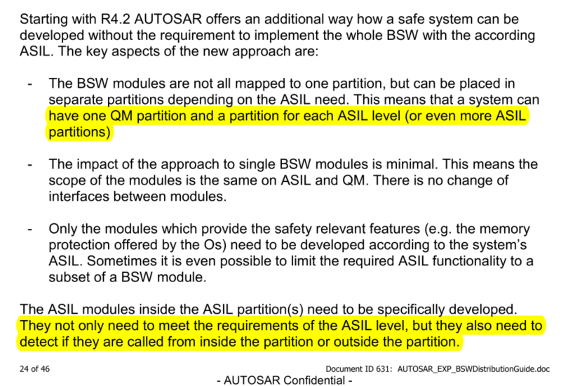 - ASIL软件不仅要满足ASIL的开发需求,还得检查是否在相应的分区之中执行。