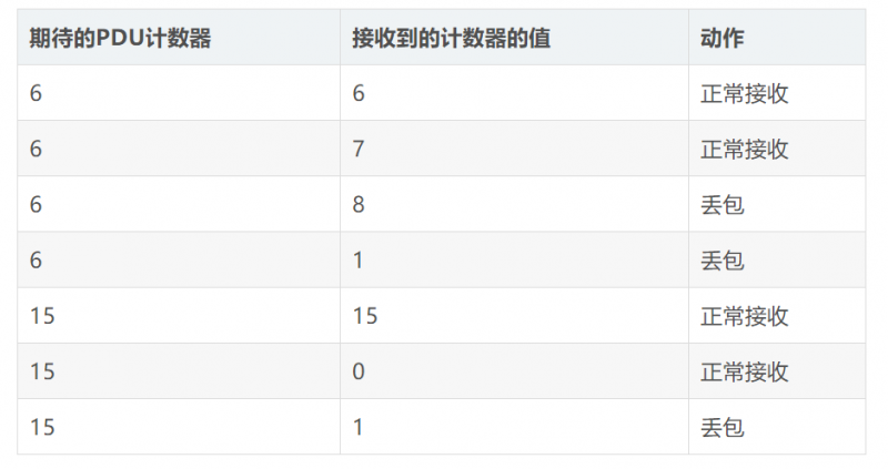 如果一个顺序计数器是4位的,它有从0到15这16个可能值。如果一个接收到一个PDU,并且接收到的计数器是15,则下一个期待的值应为0。不论接收到的值是否和实际期待的值相等,新的期待的值都应被更新。