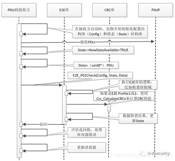 接收端的流程如图 2所示。首先,PDU的接收方初始化配置结构体和状态结构体;然后接收PDU;取得PDU的数据;根据这些参数调用E2E_PXXCheck,执行E2E的逻辑,检查CRC校验信息,检查数据计数器信息,如果都没有错误才把收到的PDU中的数据提交给应用。其中CRC校验信息可用来检查一位到两位错等硬件错误,数据计数器信息可以辅助检查到顺序出错等问题。
