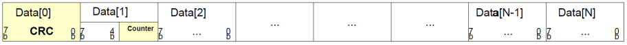 [7]: 通过E2E Profile 2处理后的数据 Buffer分布如下所示。E2E Profile 2规定Data[0]必须存放CRC校验和,Data[1]的低4个位必须存放Sequence Counter。从Data[2]开始存放需要保护的数据。
