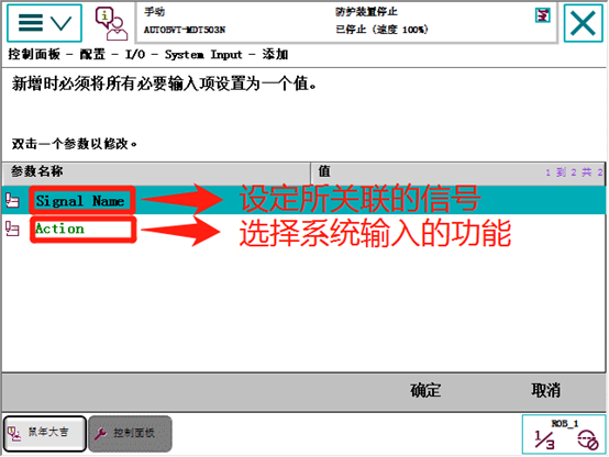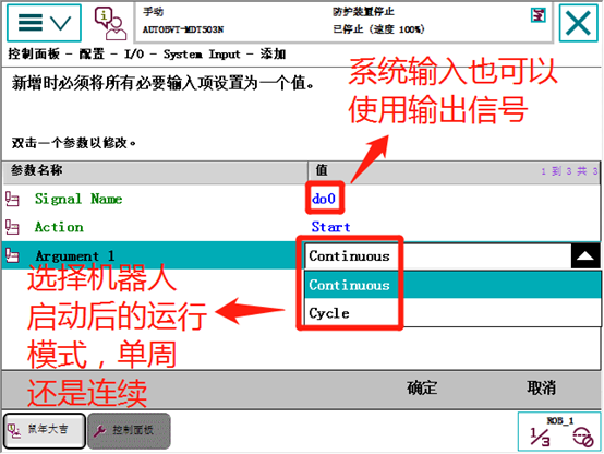 在实际应用中,Start信号应该使用Input类型信号进行关联,上边我为了演示系统输出也可以使用Output类型信号进行关联故使用了do0信号。具体使用什么信号可以根据现场的实际情况来灵活配置。下面我们就来看ABB机器人为我们提供的其它的系统I/O信号的值的含义。