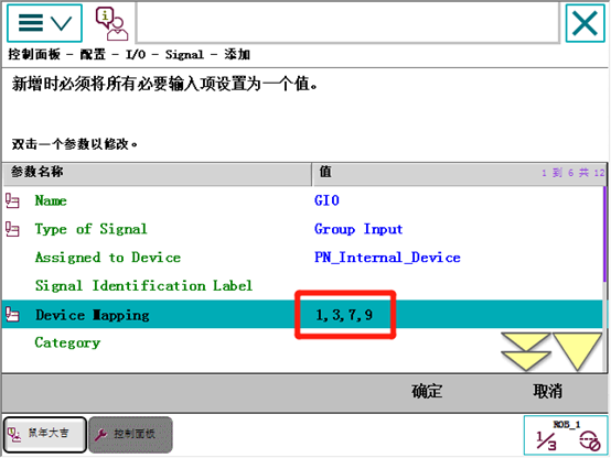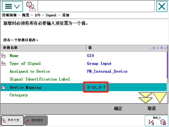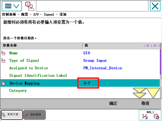 在ABB机器人的组信号配置中,地址连续的信号可以使用英文半角的“-”号将组信号的首地址与末地址连接起来即可,比如组输入GI0所占用的地址为0,1,2,3,4,5,6,7那么地址配置成“0-7”就可以了,如下图所示: