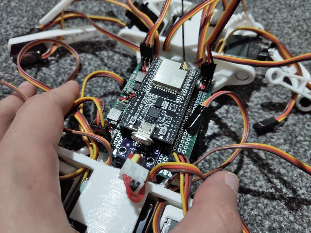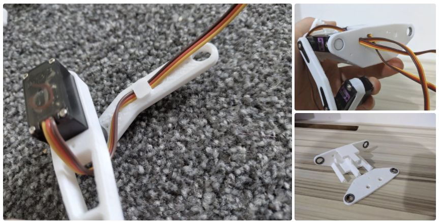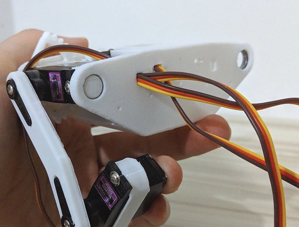 挤压没有舵机的 "肩膀 "部分(但有杜邦线),将其插入轴承之间。