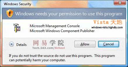 当然,最直接的改变体现在任务计划的操作界面上,不过,从严格意义上说,这应归功于Windows vista中升级的MMC (Microsoft Management Console : 微软管理控制台)。在Windows vista中,微软将MMC升级到3.0版,使得管理控制台操作更简单功能更强大,将任务计划以管理单元的方式集成到MMC中将更方便地调度任务,不过,带来的不利一面则是,作为管理员工具的MMC,在运行时需提升权限,如果系统未关闭UAC的话,在打开任务计划时会弹出UAC确认窗口: