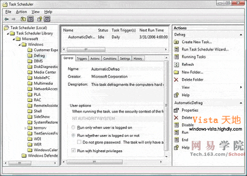比如说,在Windows Vista中,周期性的硬盘碎片整理在默认安装中是自动的,这能够在相当程度上保证系统性能与健康状态。那么,这个自动运行的程序是如何设定的呢?我们可以在计划任务中查看它的设定细节,展开任务计划库(Task Scheduler Library)找到磁盘整理项即可看到相应的细节: