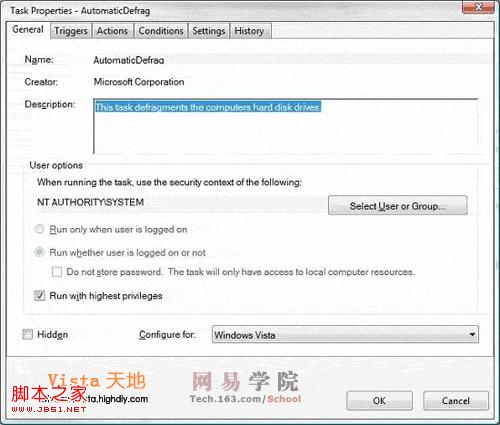 由上图可以看出,在默认安装设置中,硬盘碎片整理任务设定为无论用户登录与否均自动运行,当然,因磁盘碎片整理程序也是一个管理员级别的任务,在任务计划中它被设置为自动提升操作权限。