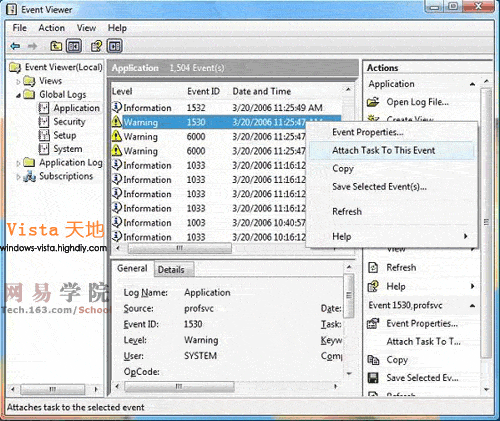 比如说,在事件查看器应用程序日志中ID为1530的事件为例,该事件说明注册文件未正确卸载,我们可以针对此事件创建一个新的计划任务:在事件查看器中的右键单击该项,选择“Attach Task To This Event”: