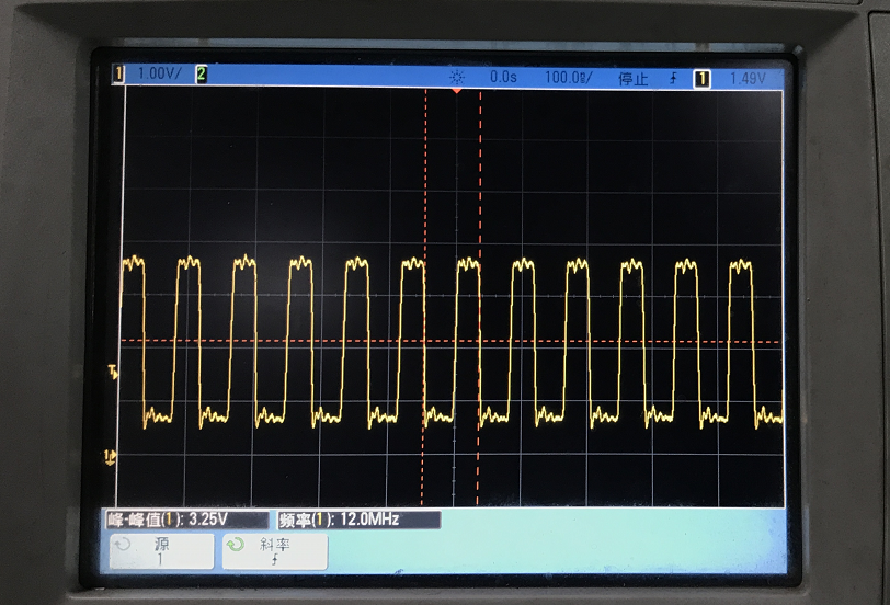 将内部IRC时钟通过切换矩阵SWM 切换到输出pin脚CLKOUT,通过示波器可以看到如下的波形,显示IRC时钟位12M。