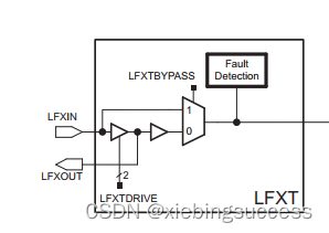以上分类是从使用角度来说的,如果我们单看晶振的内部构造,就会发现有源晶振内部是包含了一个无源晶振,然后再将阻容、放大等电路也包含进去,整体封装好再给我们用。 有源晶振内部构造包含了无源晶振,所以一般来说,有源晶振比无源晶振要贵。另一方面,我们只要了解了无源晶振的特性,有源晶振也就差不多了。毕竟,有源晶振可以看成是无源晶振做成的一个具体电路,供上电就能输出振荡信号了。所以,下面我们就只看无源晶振(晶体谐振器)。如上图所示LFXIN和LFXOUT内部电路有一个反向器,在上电的瞬间就在外部晶振上施加反向电压,反向电压就会使晶体产生逆压电效应,晶振就可以起振了。