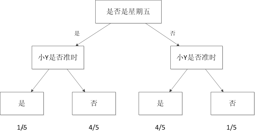 刚才的思考过程我只考虑“频次”这种属性。在真实的机器学习中,这可能都不算是一个应用。一般的机器学习模型至少考虑两个量:一个是因变量,也就是我们希望预测的结果,在这个例子里就是小Y迟到与否的判断。另一个是自变量,也就是用来预测小Y是否迟到的量。假设我把时间作为自变量,譬如我发现小Y所有迟到的日子基本都是星期五,而在非星期五情况下他基本不迟到。于是我可以建立一个模型,来模拟小Y迟到与否跟日子是否是星期五的概率。见下图: