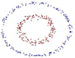 我们如何在二维平面划分出一个圆形的分类界线?在二维平面可能会很困难,但是通过“核”可以将二维空间映射到三维空间,然后使用一个线性平面就可以达成类似效果。也就是说,二维平面划分出的非线性分类界线可以等价于三维平面的线性分类界线。于是,我们可以通过在三维空间中进行简单的线性划分就可以达到在二维平面中的非线性划分效果。
