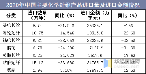 2020年中国主要化学纤维产品进口量及进口金额情况