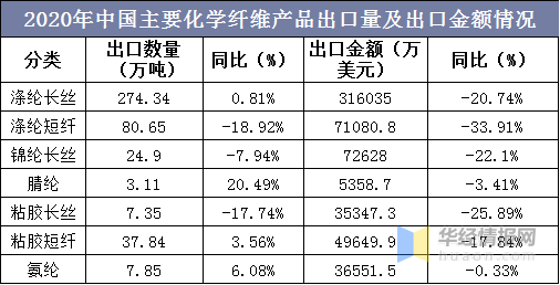 2020年中国主要化学纤维产品出口量及出口金额情况