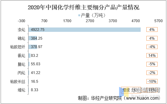 从产量细分结构来看,2020年我国化学纤维主要细分产品包括粘胶短纤、粘胶长丝、锦纶、涤纶、腈纶、维纶、丙纶、氨纶大类产品。其中产量前三的产品为涤纶、锦纶和粘胶短纤,产量分别为4922.75万吨、384.25万吨和378.97万吨。