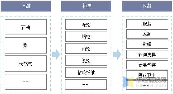 化学纤维产业链上游主要原材料为石油、煤、天然气等;中游为化血纤维生产供应环节;下游广泛应用于服装、家纺、食品包装、医疗等领域。