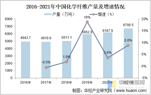 随着近年来我国经济的不断发展以及化纤工业技术的不断进步,我国化学纤维的产量持续增长。据资料显示,2021年我国化学纤维产量为6708.5万吨,同比增长8.8%。