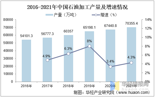 石油是化学纤维主要的原材料,随着经济的稳定增长,汽车保有量的上升,有机化工行业进入高速增长阶段等原因,原油加工量保持稳定增长态势,充足的原料保障间接促进了化学纤维行业的发展。据资料显示,2021年我国石油加工产量为70355.4万吨,同比增长4.3%。