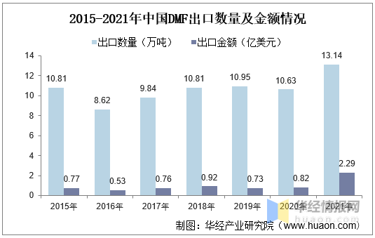 “N,N-二甲基甲酰胺”海关编码“29241910”。从进出口情况来看,首先,我国DMF行业产能过剩,出口远大于进口。其次,2021年DMF价格大幅上涨,我国出口金额水涨船高。据统计,2021年,我国DMF出口数量为13.14万吨,出口金额为2.29亿美元。