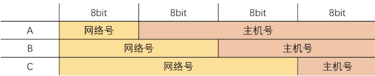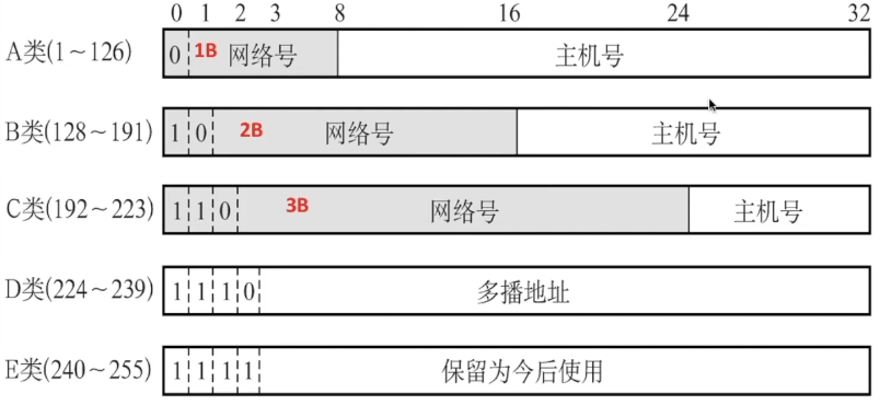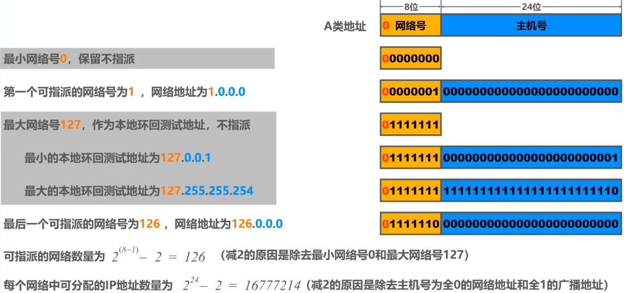 - 只有A类、B类和C类地址可分配给网络中的主机或路由器的各接口。