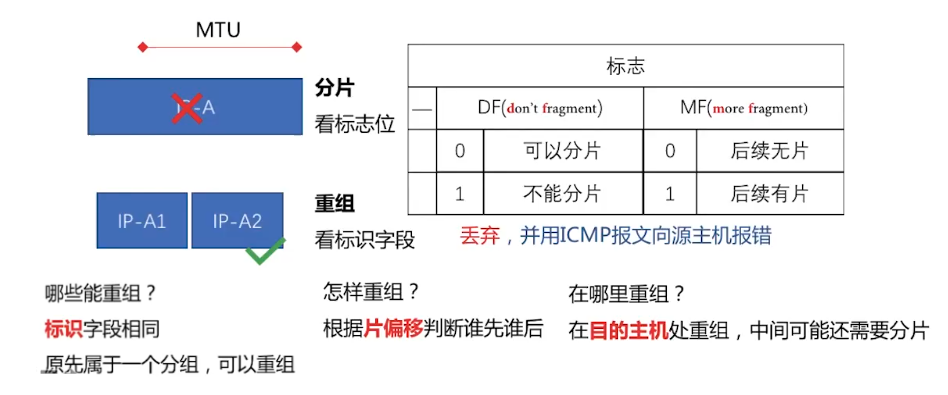 DF位:1表示不允许分片;0表示允许分片。如果分组长度超过MTU,且当DF=1时,丢弃该分组,并用ICMP差错报文向源主机报告