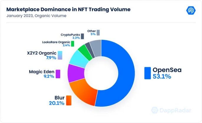 最新数据显示,今年1月,Blur以1.87亿美元的交易额位居第二,占市场份额的 20%,同期OpenSea占市场份额53%。虽然Blur还远远比不上OpenSea,但要知道,OpenSea曾长期占据市场80%的份额。