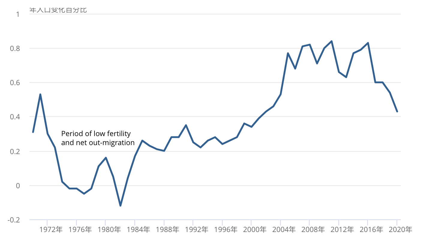 当前的增长水平处于 2001 年以来的最低水平,表明近期的高增长趋势有所下降,从 2004 年年中到 2019 年年中在 0.5% 至 0.8% 之间。尽管人口变化率有所下降,但仍高于 1972 年中期至 2001 年中期的任何一年。