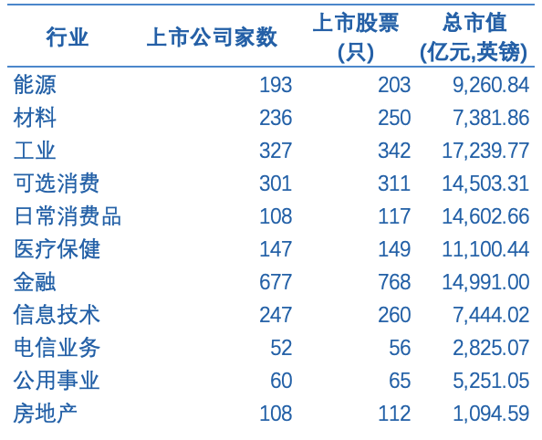 表 英国上市公司成分行业分布