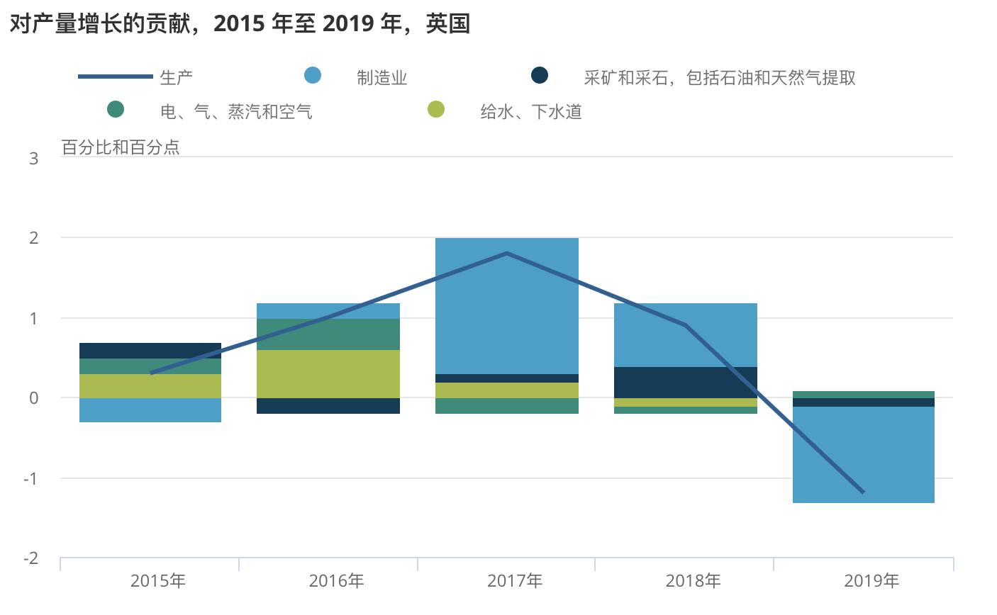 2015年至2017年,生产增速大幅上升,从2015年的0.3%上升到2017年的1.8%。2017 年对增长的积极贡献。到 2017 年,制造业增长占生产增长的 90% 以上。这在一定程度上反映了制造业出口强劲,这受到 2016 年欧盟公投后英镑贬值和重要国际市场需求强劲的支撑。