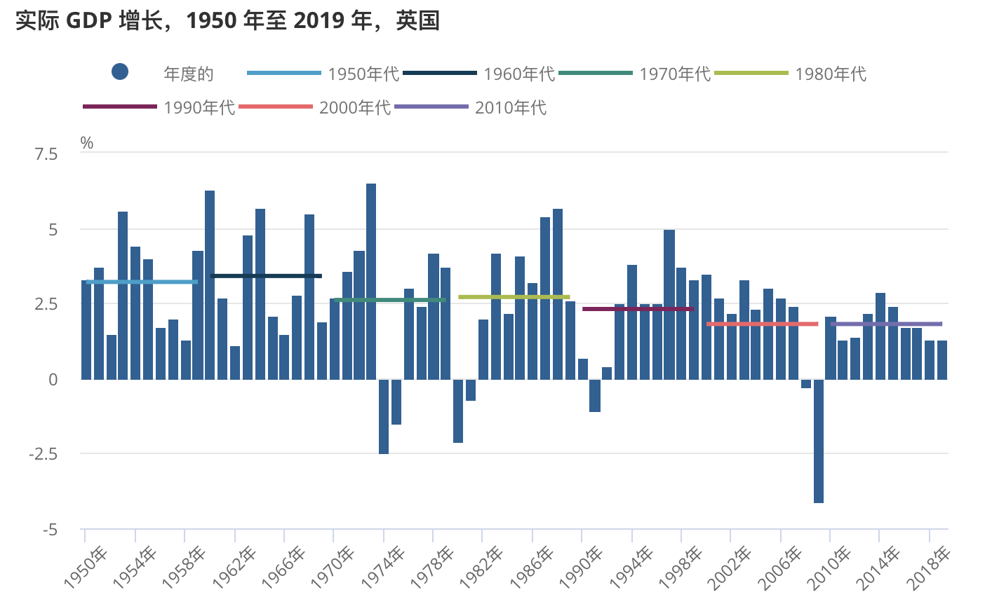 通过查看英国 1950 年至 2019 年间的年度 GDP 增长率显示了英国经济如何随着时间的推移而演变。英国的 10 年平均增长率在过去几十年中有所放缓。在 1950 年到 1959 年的十年间,平均增长率为 3.2%。在 2010 年至 2019 年的最近十年中,这一增长率几乎减半至 1.8%。在最近十年内也可以看到这种放缓。2010 年代上半年的平均增长率为 2.0%,2010 年代下半年放缓至 1.7%。在过去五年中,英国 GDP 增长从 2015 年的 2.4% 放缓至 2019 年的 1.3%。