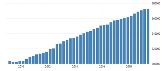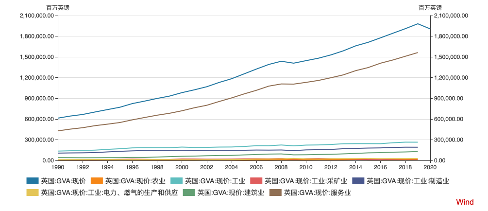 二季度相较一季度来看,服务业有略微上涨。近十多年来服务业一直处于强势上涨当中。从1990到2019,平均每个季度服务业为273474.96 GBP Million,其中在2019年第二季度达到最高372728 GBP Million,1990年第三季度达到最低182006 GBP Million。