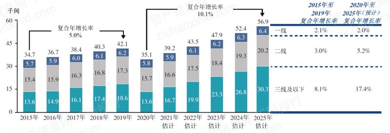 截至 2019 年末,中国约有 4.2 万家酒馆,相较于 2015 年末的 3.5 万家,中国酒馆总数的年复合增长率达 5.0%。特别是,中国三线及以下城市的酒馆数量自 2015 年至 2019 年的年复合增长率达 8.1%,高于行业平均水平及一线城市、二线城市酒馆数量的增长水平。2020年,受新冠肺炎疫情影响,中国酒馆总数由 2019 年末的约 4.2 万家下降至 2020 年末的约3.5 万家,随着国内防疫限制政策的放宽和鼓励消费政策的出台,中国酒馆数量预计将于2021 年逐渐恢复。