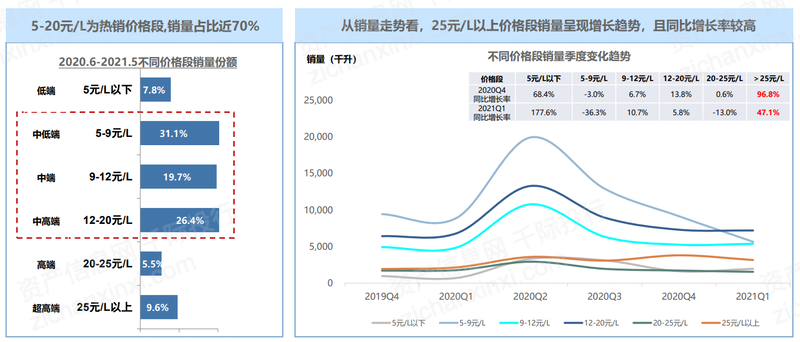 啤酒行业产品矩阵变化,高端啤酒品牌或将持续受益。近几年我国啤酒销售呈现出了明显的结构变化。按每升售价的差别,将啤酒分为三种类型:高档啤酒(14 元及以上/500ml)、中档啤酒(7-14 元/500ml)、经济型啤酒(7元及以下/500ml)。