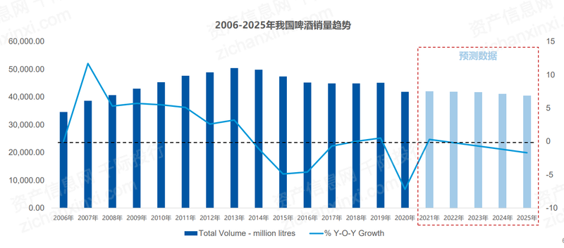 2020 年受疫情影响,三种啤酒类型的销售量和销售额均有不同程度的下降。2021 年后,我国高档啤酒的年增长率仍保持领先地位,在 4.7%左右,而经济型啤酒的销量和收入将呈现持续稳定的负增长趋势。