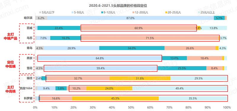 就全国性品牌打造而言,各个啤酒巨头以青啤经典(醇厚)、雪花勇闯天涯、燕京清爽,哈啤冰纯为代表,集中在单箱35元~50元价格带,成为企业利润主体。在这个平台之上,各个啤酒巨头绞尽脑汁寻找向上延展的机会。