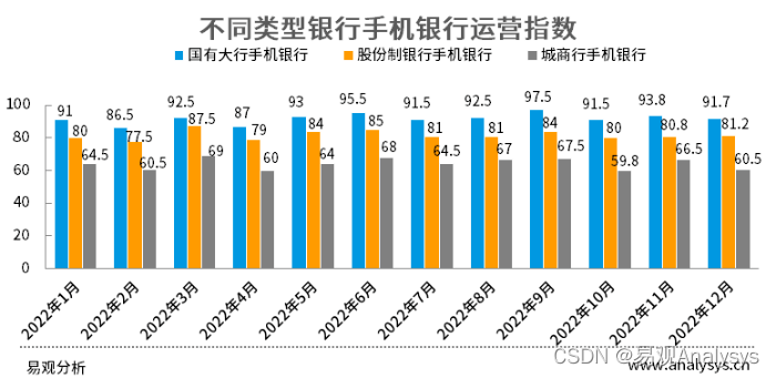 从不同类型银行手机银行运营指数来看,国有大行手机银行12月运营指数为91.7。四季度,六家国有大行均上线了手机银行新版本,丰富专属客群服务体验,挖掘普惠金融市场流量;提升APP智能化内容展示及推荐能力,工行手机银行、建行手机银行均基于用户洞察,在APP“二楼”精准展现客户经常使用的服务及个性化服务。