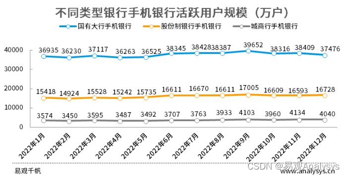 从活跃用户规模来看,12月国有大行手机银行、股份制银行手机银行、城商行手机银行活跃用户规模分别为37476万户、16728万户、4040万户,环比增幅分别为-2.4%、0.8%、-2.3%。分析认为,随着疫情全面放开,同时提高普惠人群覆盖广度,挖掘普惠金融市场流量,手机银行作为零售银行服务的主阵地,活跃用户规模预计将逐步回升。