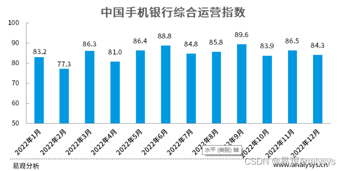 易观:由中国电子银行网、易观联合发布的“2022中国手机银行综合运营报告”显示:从总体趋势上看,2022年最后一个季度,中国银行业手机银行运营指数呈现逐月回落趋势。对此,易观分析认为,这主要是受到新冠疫情影响,居民金融需求萎缩,手机银行活跃用户规模、搜索指数出现下降。