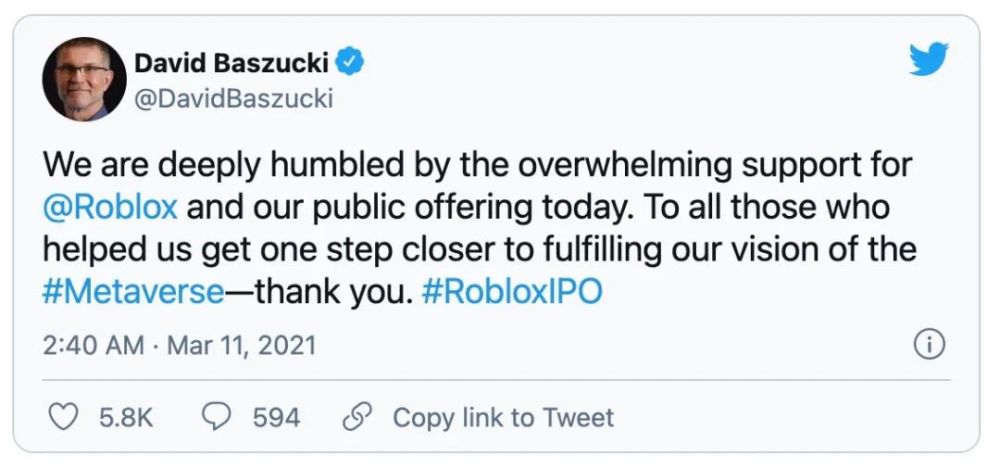 我们对 @Roblox 和我们今天的公开募股所获得的压倒性支持深感谦卑。感谢所有帮助我们离实现 #元宇宙 愿景更近一步的人,谢谢你们。