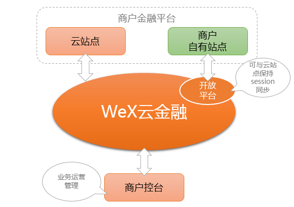 从上图中可以看出,WeX云金融支持云站点和开发平台两种模式,商户可根据自身的特点进行选择和组合,在解决效率和成本的同时,还具备自主化扩展能力。