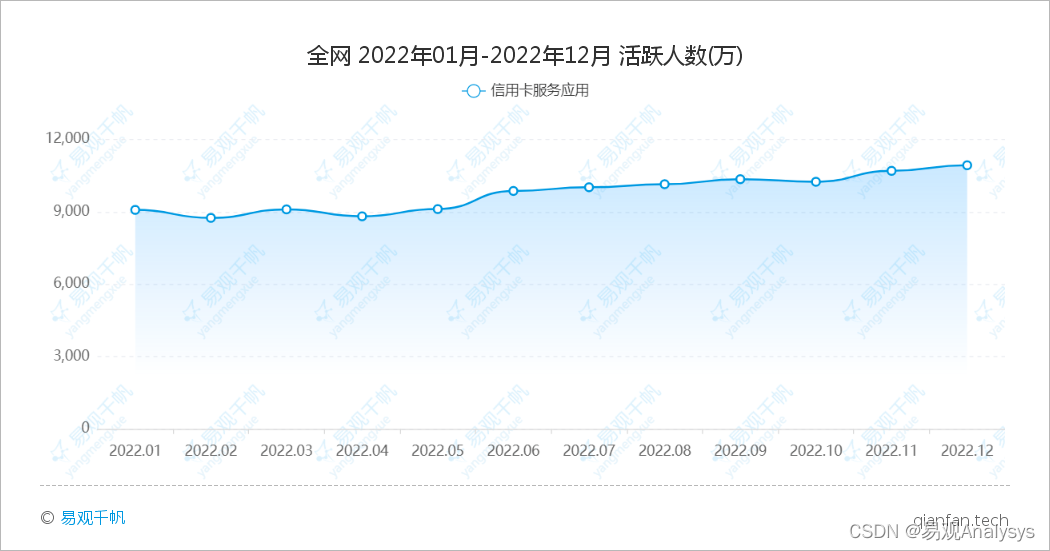 易观千帆数据显示,12月信用卡服务应用活跃人数10931.36万,环比增长2.16%。自2022年下半年起,信用卡服务应用月活规模持续走高,至12月已连续两个月保持环比增长趋势。