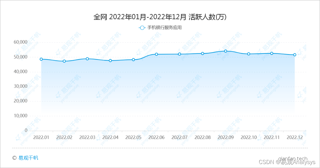 易观千帆:12月手机银行服务应用活跃人数51688.69万,环比下降1.81%。结合历史数据,2022年9月达到全年高峰的54191.75万,总体来看保持波动增长。
