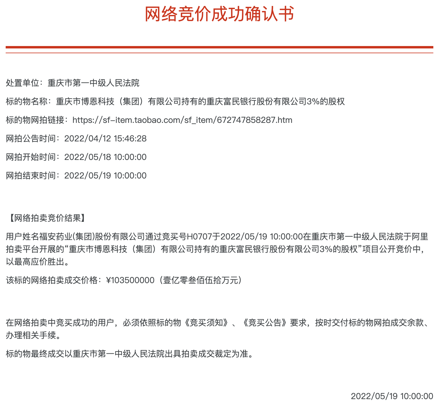 买家是谁?根据阿里司法拍卖平台披露,福安药业(集团)股份有限公司(简称“福安药业”)通过竞买号H0707于2022/05/19 10:00:00于重庆市第一中级人民法院在重庆富民银行3%的股权项目中,以1.035亿元的最高应价胜出。