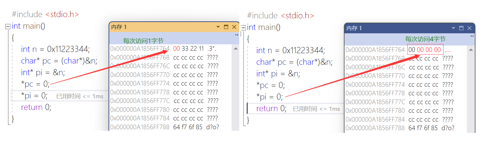 *pc = 0; //重点在调试的过程中观察内存的变化。