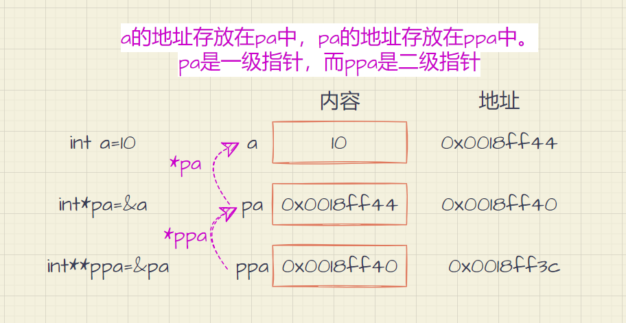 int *pa = &a;//pa就是指针变量,一级指针变量,表示指针指向的a是int