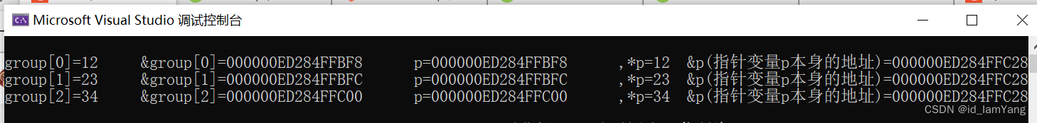 printf("ngroup[%d]=%dt&group[%d]=%ptp=%pt,*p=%dt&p(指针变量p本身的地址)=%p", i, group[i],i,&group[i],p,*p,&p);