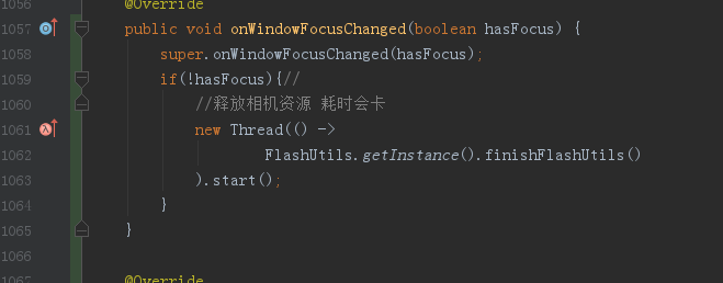 由于调用相机的闪光灯,需要在进入别的界面的时候关闭闪光灯,但是在onPause()中bugly抓取到了崩溃的日志,经过试验可能有些手机在窗口失去焦点时不会调用onPause方法,所以现在在,onWindowFocusChanged()中进行判断.